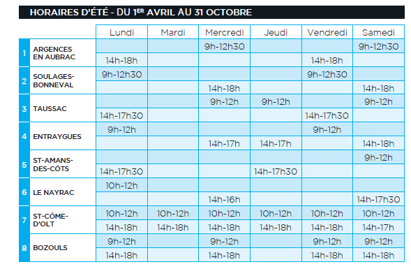 Heures d'ouverture : Mardi de 9 h à 12 h et de 13 h 30 à 18 h, Jeudi de 13 h 30 à 18 h, Vendredi de 9 h à 12 h et de 13 h 30 à 17 h